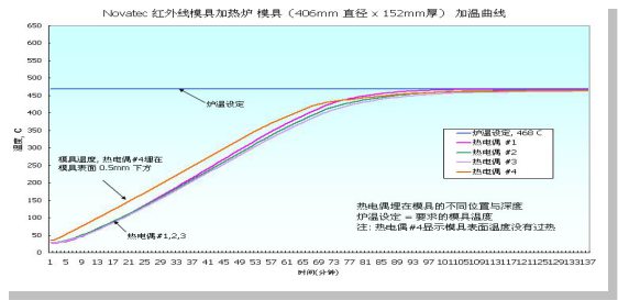 如上面所提及,相對于一個對流式爐子需要4~5個小時(客戶實例)的加熱時間,使用諾沃德紅外線模具加熱爐在 2.5小時(客戶實例)內加熱完成一個直徑 430mm x 厚330mm的模具。這能夠提供業者在擠壓機作業時更換模具的彈性,以及縮短生產時間。